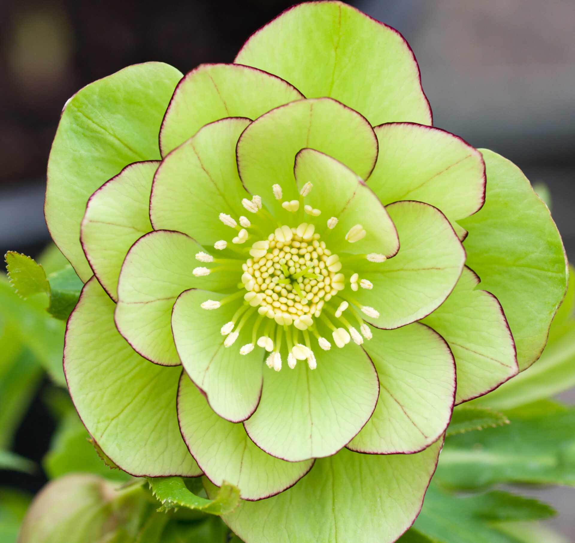 A newer variety we have been working on these for the past 6 years. Double green with a fine edge of burgundy to the edges of the sepals, very nice.